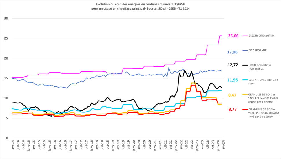 Le granulés de bois est au première trimestre 2024 l'énergie la moins cher du marché.
